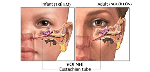 Việc nuốt liên tục lại tạo ra áp lực đẩy hơi lên tai giữa qua vòi nhĩ. Trẻ càng nhỏ, vòi nhĩ càng ngắn và nằm ngang → hơi và dịch càng dễ đi vào tai giữa.