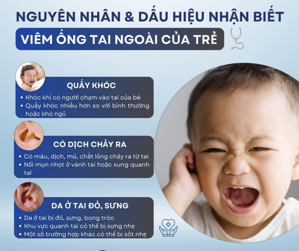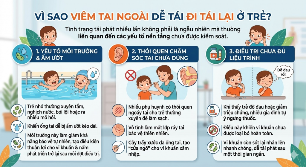 Viêm tai ngoài tái đi tái lại nhiều lần ở trẻ nhỏ không phải là tình trạng hiếm gặp, nhưng hoàn toàn có thể kiểm soát nếu xác định đúng nguyên nhân và điều chỉnh thói quen chăm sóc tai.
